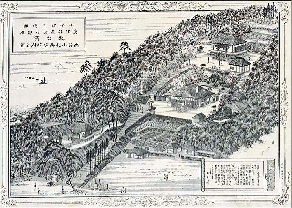 千葉県勝浦市東部の部原にある天台宗の古刹。図中右下の略縁起によれば、延暦年中(782~806)最澄の開基、貞観二年(860)円仁により再建とある。寛文三年(1663)の火災で、一切の記録・什宝類を失って詳細は不詳。寛政八年(1796)に、檀徒が協力して現在地を開き堂宇を建立した。図には、現在の豊浜海水浴場にあたる砂浜が左に見え、太平洋上に黒煙を吐く蒸気船などが見える。この頃の寺域は750坪余で、名門江澤家(博覧図に干鰯・搾粕「江澤潤一郎邸宅之図」がある)をはじめ、名主・網元の菩提寺として栄えていた。